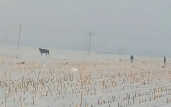 民警了解情況后為了避免瘋牛在村屯里傷害群眾,便立即組織人員開車拿著棒子等工具將瘋牛趕到了屯后的大地里。工作人員幾次試圖靠近瘋牛,但瘋牛看見有人靠近就會向人沖過來,工作人員在幾次奔跑驅(qū)趕中摔倒在了雪地里。工作人員顧不上個人安危,但考慮到采取強攻制服瘋牛的策略勢必會造成人員損傷,經(jīng)過研究準(zhǔn)備采取智取方式制服瘋牛。經(jīng)過近一小時的忙碌后,這時瘋牛的情緒逐漸穩(wěn)定下來了。工作人員見時機成熟,慢慢的靠近老牛,并快速的拽住韁繩,將牛趕上了車。最后大伙一起將牛送回了李老漢的家中。