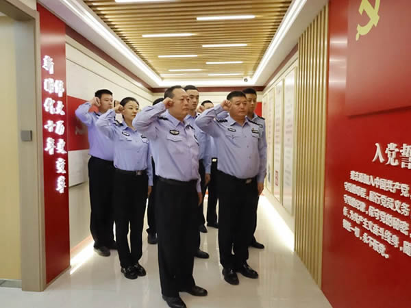 活動伊始,全體民警輔警肅立,齊聲高唱國歌。激昂嘹亮的歌聲,滿溢著對祖國母親的無限熱愛與忠誠。在激昂的國歌余韻中,黨員民警輔警整齊列隊,面對黨旗,高舉右拳,重溫入黨誓詞,鏗鏘有力的誓言回蕩在派出所的每一個角落,讓人心潮澎湃。在政治理論學習中,黨支部書記深入淺出地圍繞中央八項規定精神展開講解,黨員民警輔警結合自身工作實際,積極踴躍交流討論,分享著各自的心得體會。