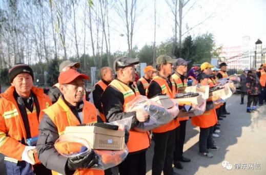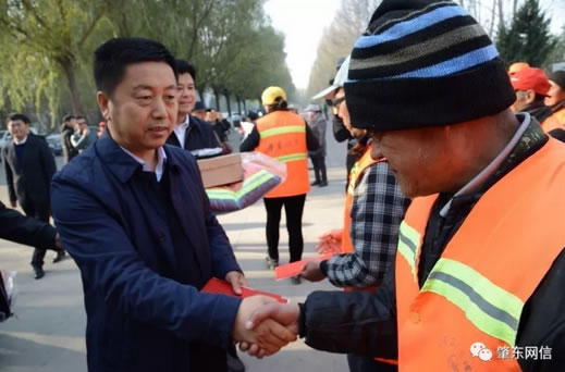 在西園區辦事處佳和社區環衛工作現場,李延春與環衛工人代表一一握手,并向環衛工人發放了冬季棉衣、棉帽、手套、棉鞋等冬季保暖用品及慰問金。