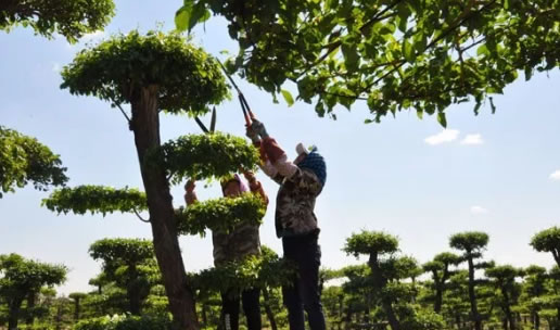 5月20日,肇東市農戶正在蘇萌園林產業扶貧基地為成品造型樹進行修枝整形。