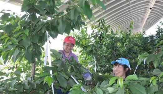 5月29日,肇東市蘇萌園林五站鎮種植基地的工人正在為溫室大棚櫻桃樹疏枝,改善通風條件,促進大櫻桃早成熟,著色好,品質優。