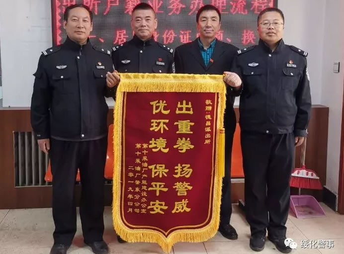 4月19日,大慶采油十廠生產(chǎn)運(yùn)行部相關(guān)領(lǐng)導(dǎo)到肇東市公安局德昌派出所,將寫(xiě)有'出重拳,揚(yáng)警威,優(yōu)環(huán)境,保平安'的錦旗送給德昌派出所,感謝多年來(lái)對(duì)油田企業(yè)發(fā)展所做的努力。