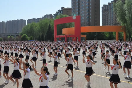“古詩(shī)韻律操”是采用學(xué)生一邊吟誦經(jīng)典古詩(shī)詞,一邊做韻律操的形式,通過(guò)選取學(xué)生必背古詩(shī)詞22首加上動(dòng)作形成古詩(shī)韻律操,并不定期更換內(nèi)容,將古詩(shī)詞誦讀和韻律操相結(jié)合編排,演繹經(jīng)典古詩(shī)詞的韻律,做到“以操促德、以操輔知、以操健體、以操審美”。隨著優(yōu)美的經(jīng)典樂(lè)曲,和著耳熟能詳?shù)墓旁?shī),孩子們嫻熟地做著韻律體操,動(dòng)作如舞蹈一般,時(shí)而輕盈、時(shí)而剛勁、時(shí)而堅(jiān)定、時(shí)而歡快,一招一式都將音樂(lè)、詩(shī)韻融入其中,完美展示出古詩(shī)韻律操的獨(dú)特魅力,切實(shí)達(dá)到了提高學(xué)生綜合素質(zhì)的目的。